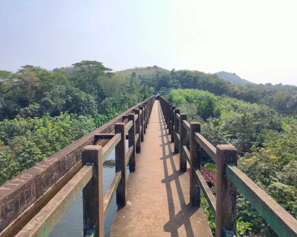 The structure stretches over a scenic gorge surrounded by lush greenery, offering breathtaking views of forests, hills, and flowing water below. A pedestrian pathway runs alongside the aqueduct, allowing visitors to walk across the bridge and experience the height and beauty of the surroundings. The cool breeze and panoramic views make it a unique attraction for nature lovers and photographers.