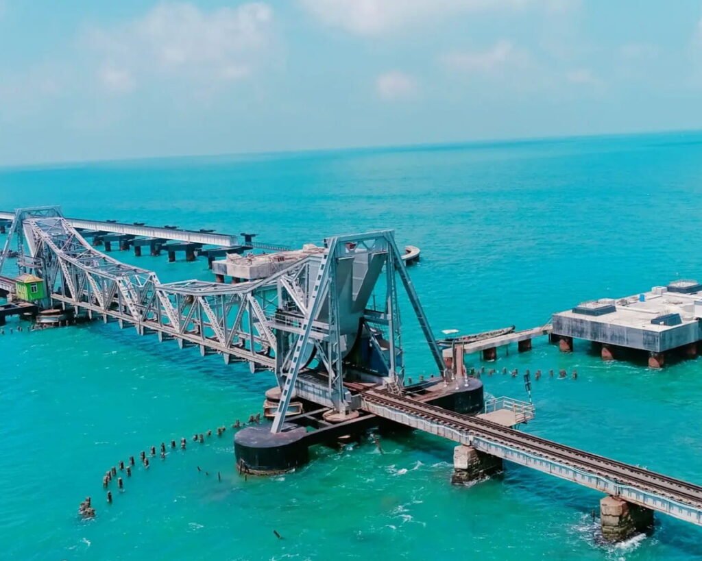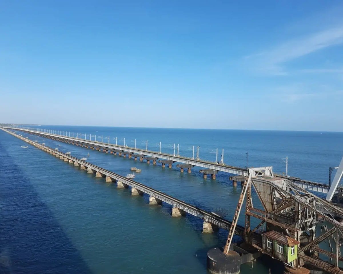 The Pamban Bridge is an iconic engineering marvel connecting Rameswaram Island to the mainland of Tamil Nadu at Mandapam. Built in 1914, it is India’s first sea bridge and remains one of the most scenic railway bridges in the country. Stretching across the turquoise waters of the Palk Strait, the bridge offers breathtaking views of the sea on both sides.